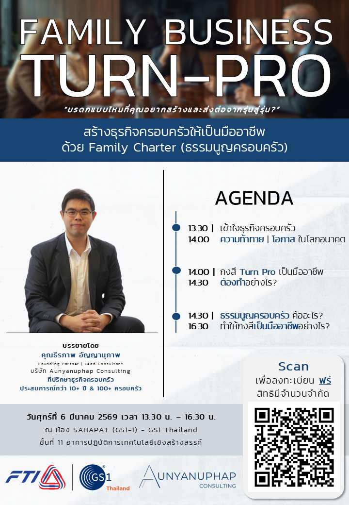 งานสัมมนาหลักสูตร Family Business Turn-Pro: สร้างธุรกิจครอบครัวให้เป็นมืออาชีพด้วย Family Charter (ธรรมนูญครอบครัว) กลับมาอีกครั้งตามคำเรียกร้อง!!!🎉เฉพาะสมาชิก GS1/FTI เท่านั้น 🎉 งานสัมมนาหลักสูตร Family Business Turn-Pro: สร้างธุรกิจครอบครัว ให้เป็นมืออาชีพด้วย Family Charter (ธรรมนูญครอบครัว) สร้างธรรมนูญครอบครัวที่ใช้งานได้จริงใน 3 ชั่วโมงธรรมนูญครอบครัวคืออะไร??ทำให้กงสีเป็นมืออาชีพได้อย่างไร??✅ลงทะเบียน FREE!! 🔥 ด่วน..ที่นั่งจำนวนจำกัด!!! วันศุกร์ที่ 6 มีนาคม 2569 ณ ห้อง SAHAPAT (GS1-1) ชั้น 11 สถาบันรหัสสากล 13.30 น. - 16.30 น. ลงทะเบียนได้ที่นี่ https://forms.gle/L5HZKhmv4LstMREg9 คุณปทิตตา 02-345-1197 patittak@gs1thailand.org Facebook-f Instagram Youtube แนะแนวเรื่อง Previous Postสถาบันรหัสสากล ร่วมกับ วิทยาลัยอาชีวศึกษาอุดรธานี จัดโครงการอบรมเชิงปฏิบัติการ