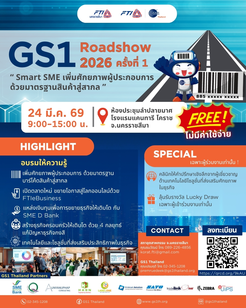📢 GS1 Thailand Roadshow 2026 ครั้งที่ 1 @นครราชสีมา 📢Smart SME เพิ่มศักยภาพผู้ประกอบการด้วยมาตรฐานสินค้าสู่สากล Read More 27/02/2026