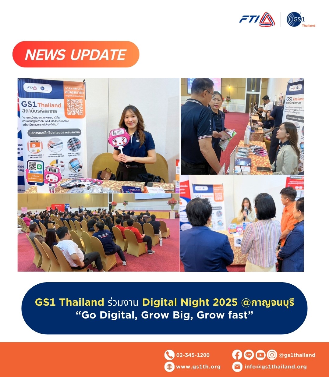 GS1 Thailand เข้าร่วมงาน Digital Night 2025 @กาญจนบุรี “Go Digital, Grow Big, Grow fast” GS1 Thailand เข้าร่วมงาน Digital Night 2025 @กาญจนบุรี“Go Digital, Grow Big, Grow fast” (23 ก.ย. 68) สภาอุตสาหกรรมแห่งประเทศไทย โดย สถาบันรหัสสากล (GS1 Thailand) เข้าร่วมออกบูธแนะนำบริการและให้ความรู้เกี่ยวกับบาร์โค้ดมาตรฐานสากล GS1 ในงาน Digital Night 2025: Go Digital, Grow Big, Grow Fast ณ ห้องประชุม อาเซียน 2 โรงแรมพีลูดส์ จ.กาญจนบุรี งานดังกล่าวจัดขึ้นเพื่อขับเคลื่อนกาญจนบุรีสู่การเป็นศูนย์กลางเศรษฐกิจดิจิทัลในภูมิภาคตะวันตก โดยมุ่งส่งเสริมการใช้เทคโนโลยีและนวัตกรรม โดยเฉพาะ AI เพื่อยกระดับธุรกิจ การท่องเที่ยว เมืองอัจฉริยะ (Smart City) และคุณภาพชีวิตประชาชน ภายในงานมีการเสวนาและแลกเปลี่ยนแนวคิดจากภาครัฐ เอกชน และการศึกษา อีกทั้งยังเปิดโอกาสให้ผู้ประกอบการนำเสนอเทคโนโลยี สร้างเครือข่าย และต่อยอดความร่วมมือ Facebook-f Line Instagram Youtube แนะแนวเรื่อง Previous PostGS1 Thailand ร่วมงาน GS1 Malaysia Summit 2025 ภายใต้แนวคิด “การขับเคลื่อนความยั่งยืนและเศรษฐกิจหมุนเวียน” Next PostGS1 Thailand จัดงานสัมมนาพิเศษ “Trend Future of RFID-Enabled Printing” และร่วมออกบูธให้ความรู้และแนะนำการใช้งานมาตรฐานสากล GS1 ในงาน Pack Print International 2025